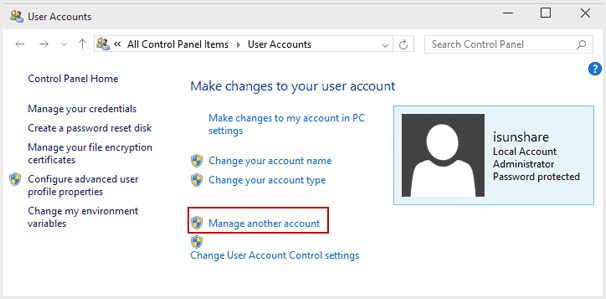 3. 在用户帐户窗口中,单击管理另一个帐户。