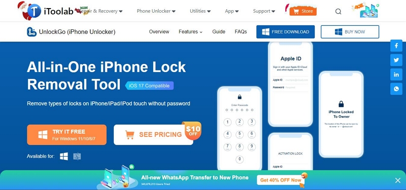 iToolab UnlockGo 是一款备受推崇的工具,可用于绕过 MDM 锁定。它提供了一个全面的解决方案,无需密码即可删除 iPhone、iPad 和 iPod touch 上的各种类型的锁。它可用于删除 MDM 锁、iCloud 激活锁、Apple ID 锁、屏幕密码和禁用的 iPhone 锁,无论原因为何。只需点击几下即可。您甚至不需要精通技术就能够使用该工具。