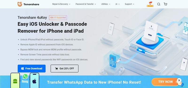 我们列表中的下一个是 Tenorshare 4uKey。这是另一款终极iOS解锁器,支持在iPhone和iPad版本上解除MDM锁定。它可用于绕过 MDM 锁定并删除 MDM 配置文件,无需密码,只需单击几下即可。