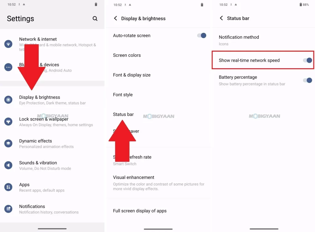 - 前往设置 -> 显示和亮度 -> 状态栏 -> 显示实时网速并打开滑块。