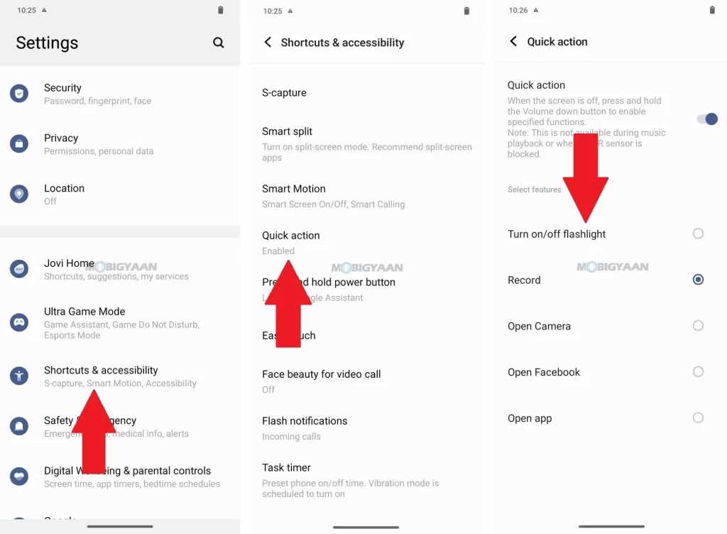 如何打开手电筒?通过解锁手机?为什么不简单地按住音量降低键来完成此操作,并且无需解锁手机呢? vivo T2 Pro 5G允许您简单地为音量减小键添加手电筒快捷方式。如果您不知道,请执行以下操作:启动设置应用程序,前往快捷方式和可访问性,然后点击快速行动。选择您喜欢的选项,默认情况下启用手电筒。
