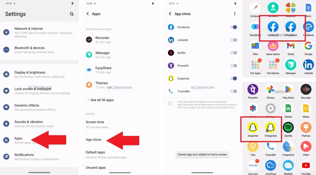 通过应用程序克隆,您可以为 Facebook、Snapchat、WhatsApp、Instagram、LinkedIn、PhonePe 等应用程序以及该功能支持的应用程序创建副本。要使用此功能,请访问设置 -> 应用程序 -> 应用程序克隆并打开要克隆的应用程序的滑块。