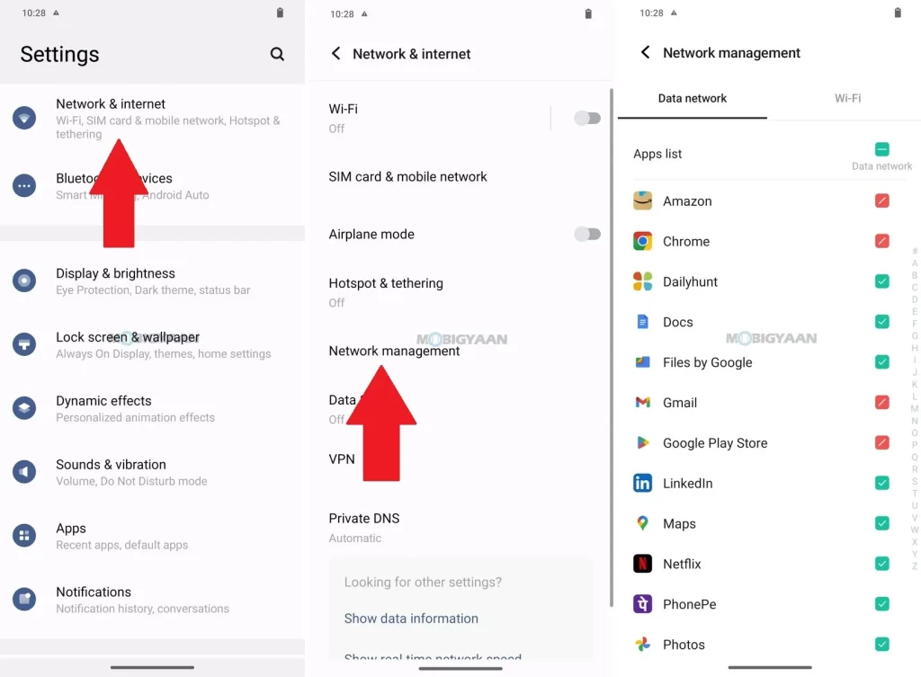 您是否想知道哪些应用程序正在挂钩您的数据?如果不确定,您可以使用互联网终止开关来阻止应用程序使用您的数据或 Wi-Fi。您可以选择不使用的应用程序并取消选中它们使用数据或 Wi-Fi。这可以在您的 vivo T2 Pro 5G 上完成,您所要做的就是前往设置 -> 网络和互联网 -> 网络管理并仅将复选框标记为您使用且需要互联网访问的那些应用程序。