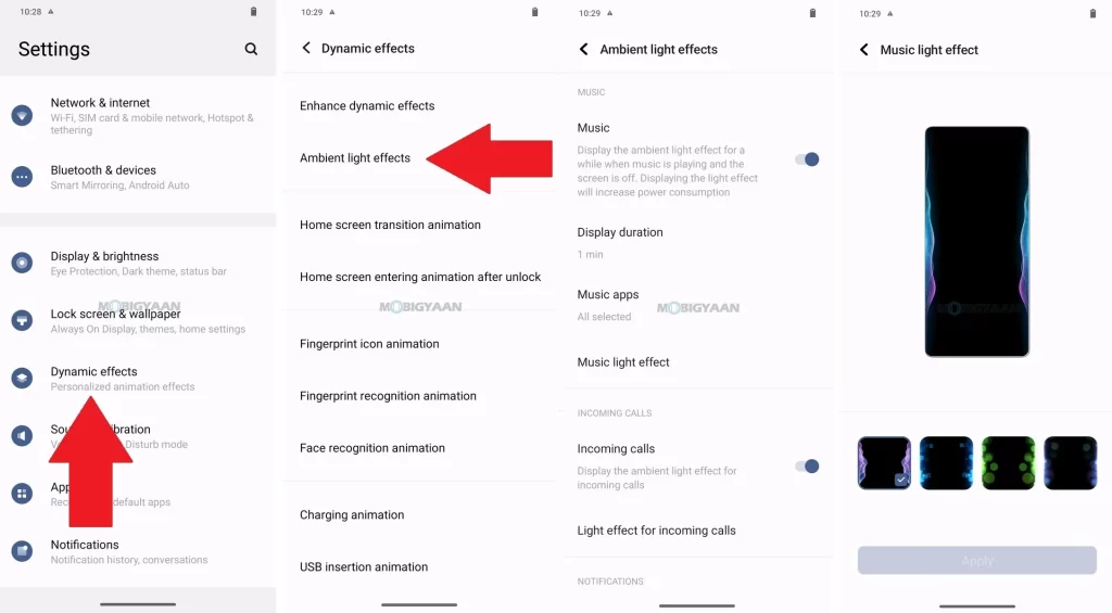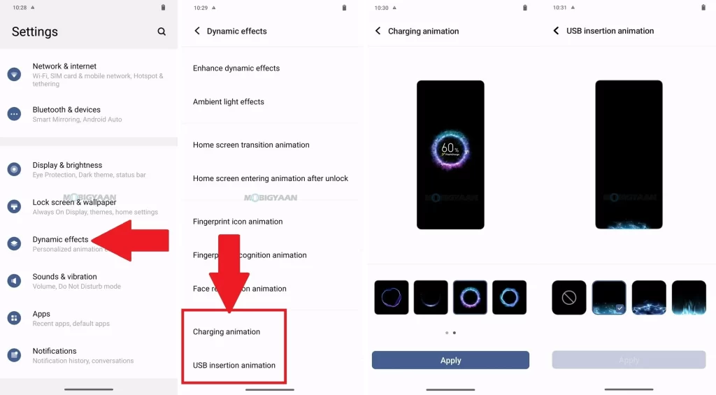 就像更改指纹动画一样,您还可以更改 USB 充电动画以及 USB 插入动画。这些可以像前面所示的那样完成,请转到设置->动态效果->充电动画或者USB插入动画并从提供的列表中选择您喜欢的一项。
