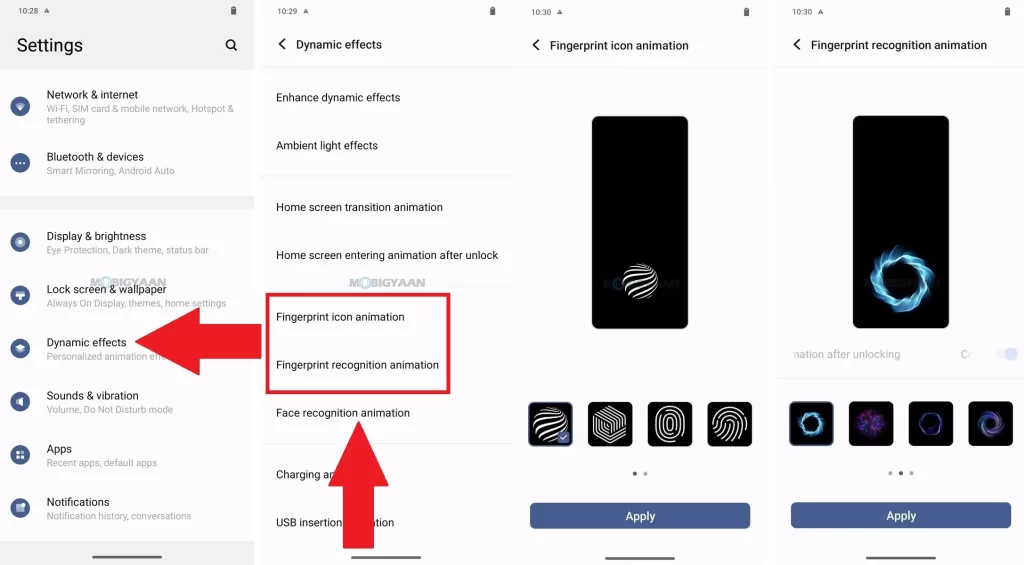 如果你使用vivo T2 Pro 5G上的指纹扫描仪(我相信你会这样做),你可以在解锁手机时看到动画。可以通过动态效果设置更改或自定义该动画。您可以执行以下操作,请访问设置->动态效果->指纹识别动画并从提供的列表中选择您喜欢的一项。您还可以选择动态效果 -> 指纹图标动画更改屏幕上显示的指纹图标。就这样,享受新的指纹动画吧。