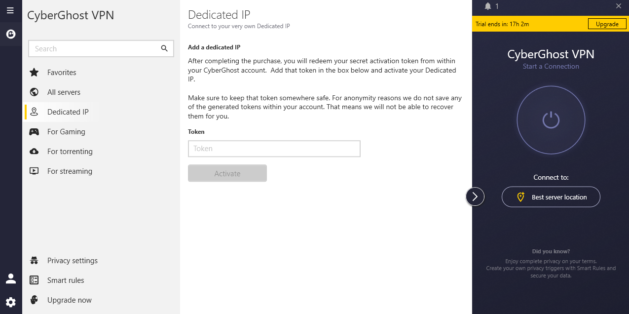 当您注册 CyberGhost 高级版并在 Windows PC 上下载 VPN 应用程序时,您将获得一个专属于您的专用 IP 地址。它是独一无二的,每次连接到互联网时都会保持不变,看起来不太像 VPN 流量。