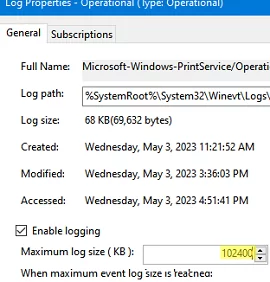 wevtutil.exe sl Microsoft-Windows-PrintService/Operational /enabled:true