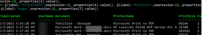 $all2dayprint=Get-WinEvent -FilterHashTable @{LogName="Microsoft-Windows-PrintService/Operational"; ID=307; StartTime=(Get-Date).AddDays(-1)} | Select-object -Property TimeCreated, @{label="UserName";expression={$_.properties[2].value}}, @{label="Document";expression={$_.properties[1].value}}, @{label="PrinterName";expression={$_.properties[4].value}}, @{label="PrintSizeKb";expression={$_.properties[6].value/1024}}, @{label="Pages";expression={$_.properties[7].value}}