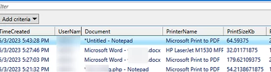 事件查看器不允许获得方便的打印历史记录统计信息,也不允许按日期/用户/文档进行搜索。您可以使用PowerShell处理和过滤打印事件。