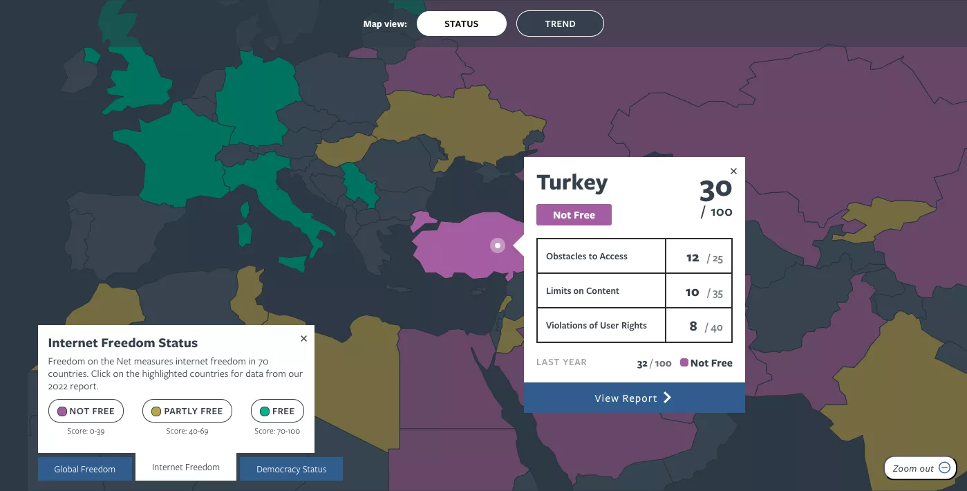 目前,土耳其的互联网自由状况是不免费,根据自由之家。因此,出于政治动机的禁令很可能在未来几年继续发生。