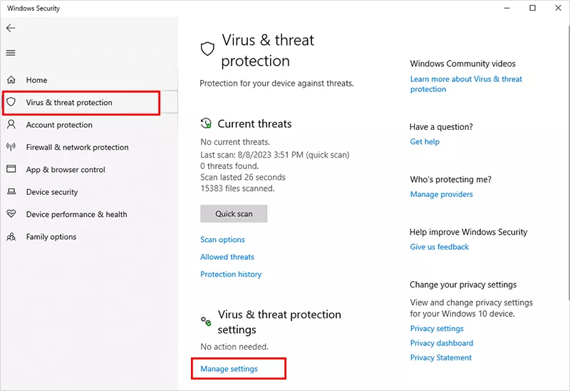 步骤2: 点击病毒和威胁防护在左侧菜单上。然后点击管理设置在右侧面板的病毒和威胁防护设置下。