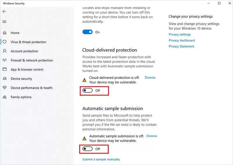 如果您想关闭云提供的保护,只需将按钮切换为灰色即可。然后它会通知您云提供的保护已关闭。与自动提交样品相同。