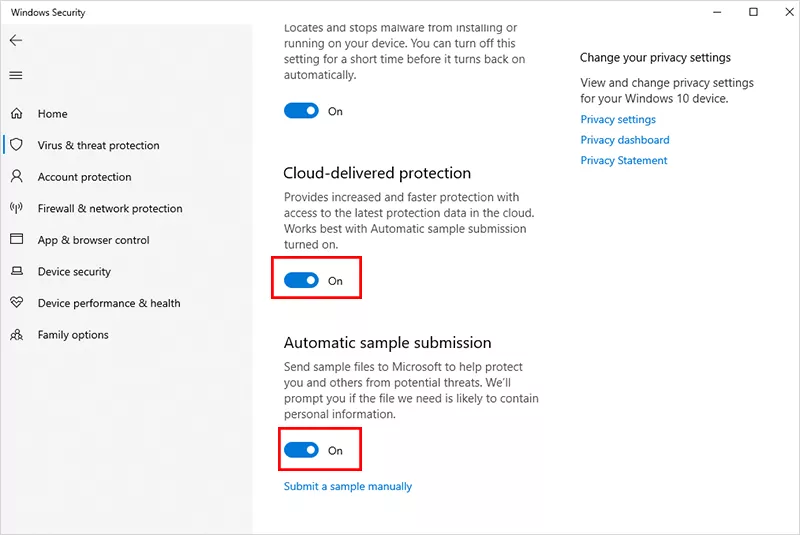 步骤3:向下滚动,您可以看到云提供的保护和自动样本提交选项。一般来说,它们是默认启用的。