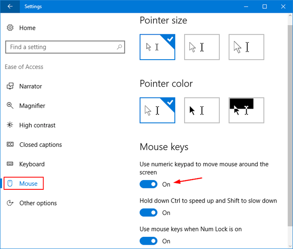 - 选择老鼠在左侧。下鼠标键部分,单击与“使用数字键盘在屏幕上移动鼠标”选项打开。