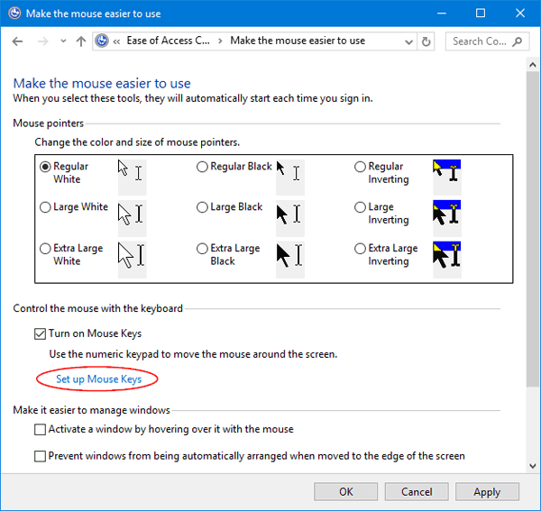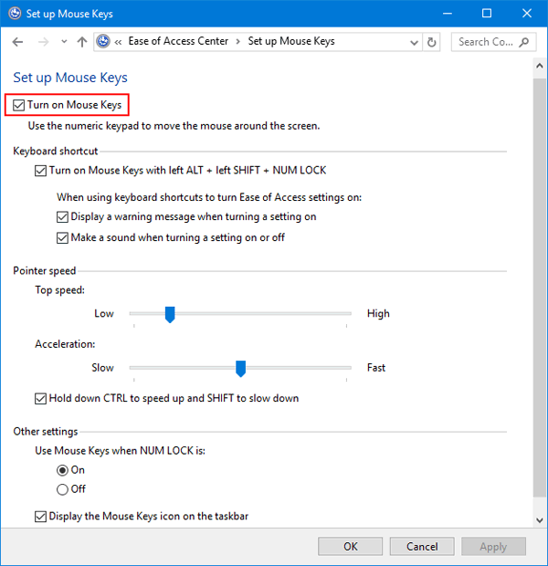 - 默认情况下,鼠标键仅在 NUM LOCK 按下时才起作用在。您可以将其更改为离开如果你喜欢的话。