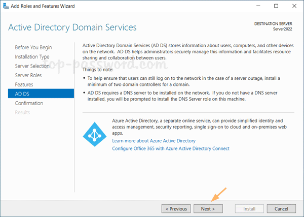 - 您现在应该会在“Active Directory Domain Services”角色旁边看到一个勾号,单击下一个。