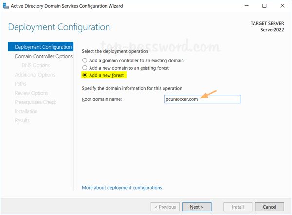 - 选择“添加新森林”选项,输入根域名并单击下一个。