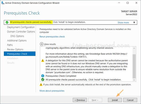 - 将执行先决条件检查。如果没有检测到错误,可以点击安装将您的服务器提升为域控制器。安装完成后,您的服务器将自动重新启动。