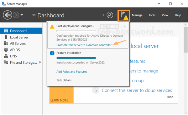 - 安装 AD DS 角色后,再次打开服务器管理器,您将在 AD DS 角色旁边看到一个通知标志管理菜单。从那里您需要单击“将此服务器提升为域控制器”。