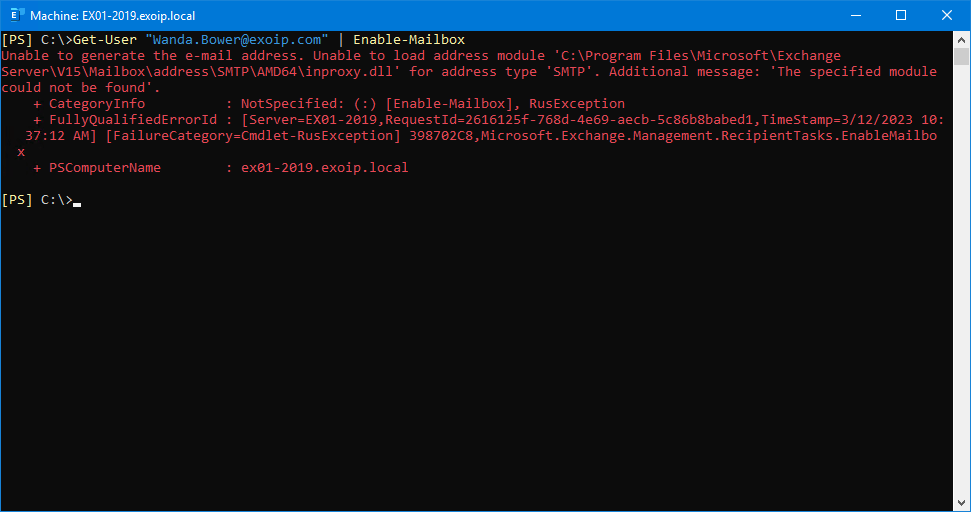 + FullyQualifiedErrorId : [Server=EX01-2019,RequestId=2616125f-768d-4e69-aecb-5c86b8babed1,TimeStamp=3/12/2023 10: