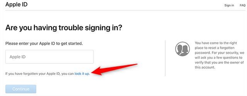 步骤1。打开iforgot.apple.com在您的计算机或移动设备上。然后,输入您的 Apple ID 和验证码。然后单击继续。