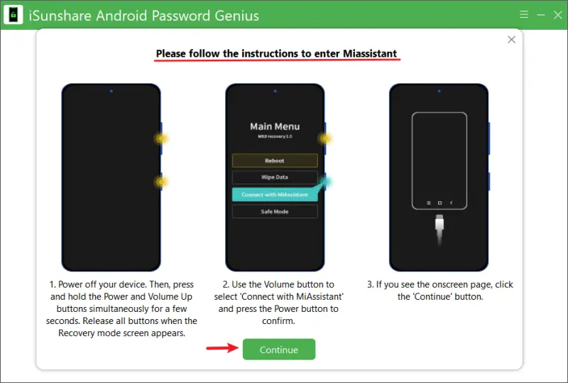 第4步:按照软件提示输入设备的“播放菜单”并确认连接小米助手,点击“继续”FRP 移除过程将自动开始。