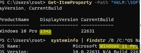 Get-ItemProperty -Path 'HKLM:SOFTWAREMicrosoftWindows NTCurrentVersion ' | select ProductName, DisplayVersion, CurrentBuild