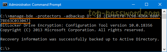 manage-bde -protectors -adbackup D: -id {CAF6FEF0-7C98-4D6A-B80F-7BE63C033047}