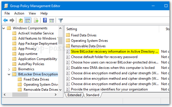 Computer Configuration -> Policies -> Administrative Templates -> Windows Components -> BitLocker Drive Encryption,然后双击策略“将 BitLocker 恢复信息存储在 Active Directory 域服务中”。