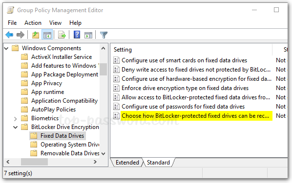 - 接下来,展开BitLocker 驱动器加密在左窗格中。您将看到三个节点:固定数据驱动器、操作系统驱动器、可移动数据驱动器。只需选择固定数据驱动器并双击策略“选择如何恢复受 BitLocker 保护的固定驱动器”。
