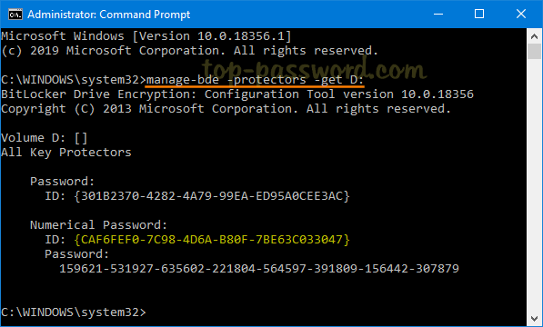 - 接下来,键入以下命令将 BitLocker 恢复密码备份到 Active Directory。请记住,您必须使用上一步中获得的数字密码 ID。
