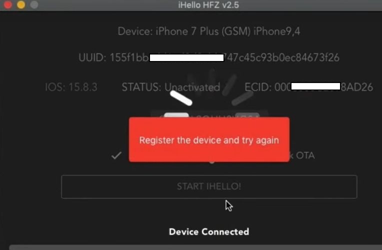请记住,iHello 需要服务器端注册才能激活。这仅意味着该工具的后端必须识别您设备的序列号。