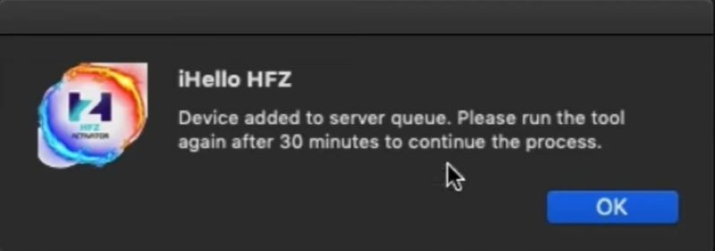 步骤2。轻敲启动 iHello越狱后。将出现一条消息,要求您在 30 分钟后重试。拔下 iPhone 的电源并让该工具在 macOS 上运行。