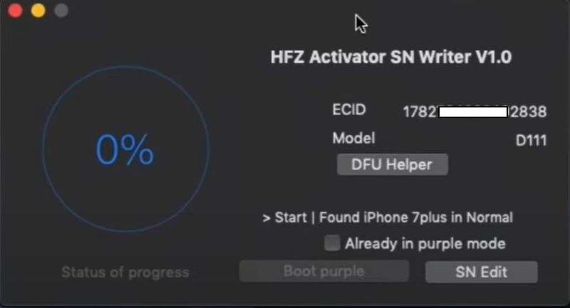 步骤 4。启动 HFZ Activator SN Writer v1.0 并再次连接您的 iPhone。将复制的序列号写入工具中。然后,您可以使用内置的 DFU 帮助程序将设备启动到紫色模式。如果失败,您可以使用 3uTools 或 Purple Mode Enabler 手动完成刷新。