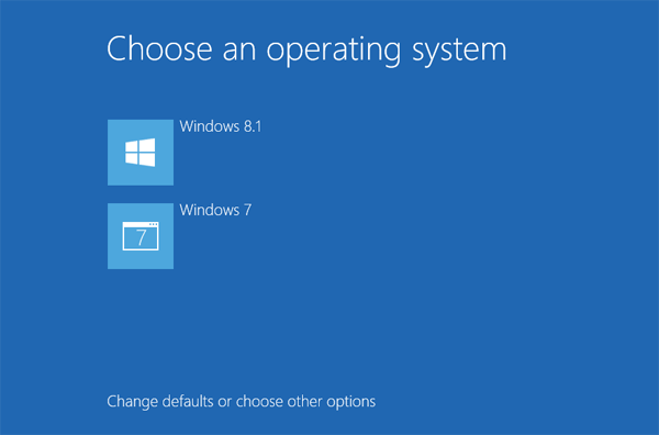 - 安装完成后,Windows 安装程序将最后一次重新启动您的系统,然后您将看到新的 Windows 8.1 风格的双启动屏幕,如下所示。如您所见,如果您不选择 Windows 7,Windows 8.1 将在 30 秒后自动启动。
