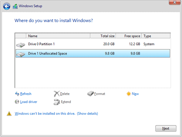 - 此时,Windows 安装程序将提示您选择要安装 Windows 8.1 的位置,您现在可以选择虚拟驱动器,该驱动器将被指定为未分配空间并为您指定的大小。正如您在下面的屏幕截图中看到的,我选择了 10GB VHD。请记住,当您选择 VHD 时,您将看到一条警告消息,指出 Windows 无法安装到该磁盘。只需忽略它并单击“下一步”即可继续。