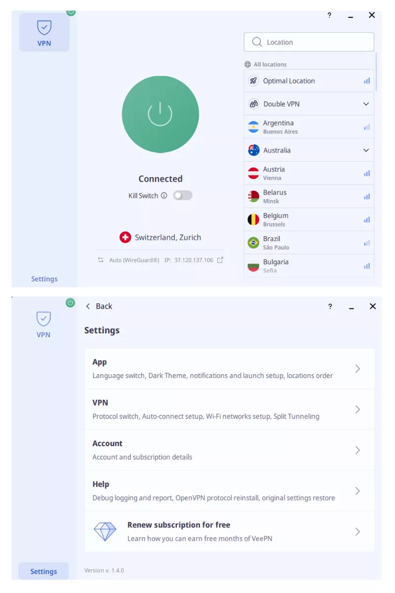 Veepn桌面和移动应用具有极简主义的外观。所有这些都使您可以快速连接到VPN,并且易于浏览。此外,与PC应用程序相比,移动设备的应用程序的设置更少。这是Windows的Veepn应用的样子: