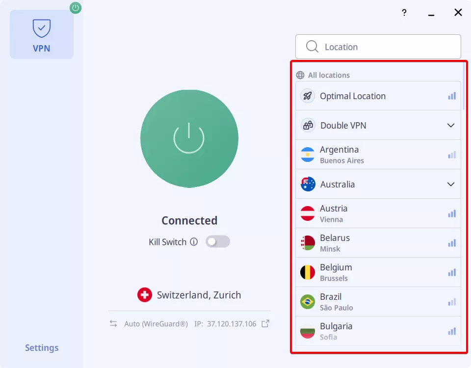 - 杀死开关。VPN连接下降发生。如果是这样,则您的数据将不受保护。杀戮开关会阻止您的Internet访问,直到您的VPN启动并再次运行。这样,您可以避免数据泄漏,当您使用公共Wi-Fi时,这特别危险。