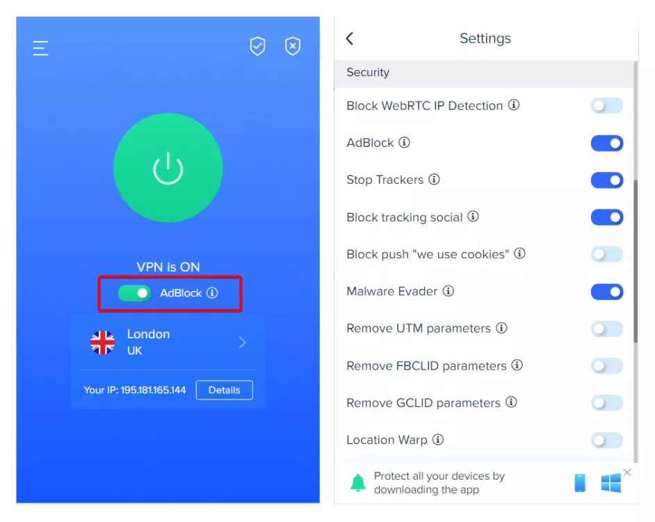 - 广告阻滞剂。快速防止烦人的广告通过切换广告块开关来使您的浏览杂乱无章。您也可以直至启用跟踪器和恶意软件阻止程序设置。