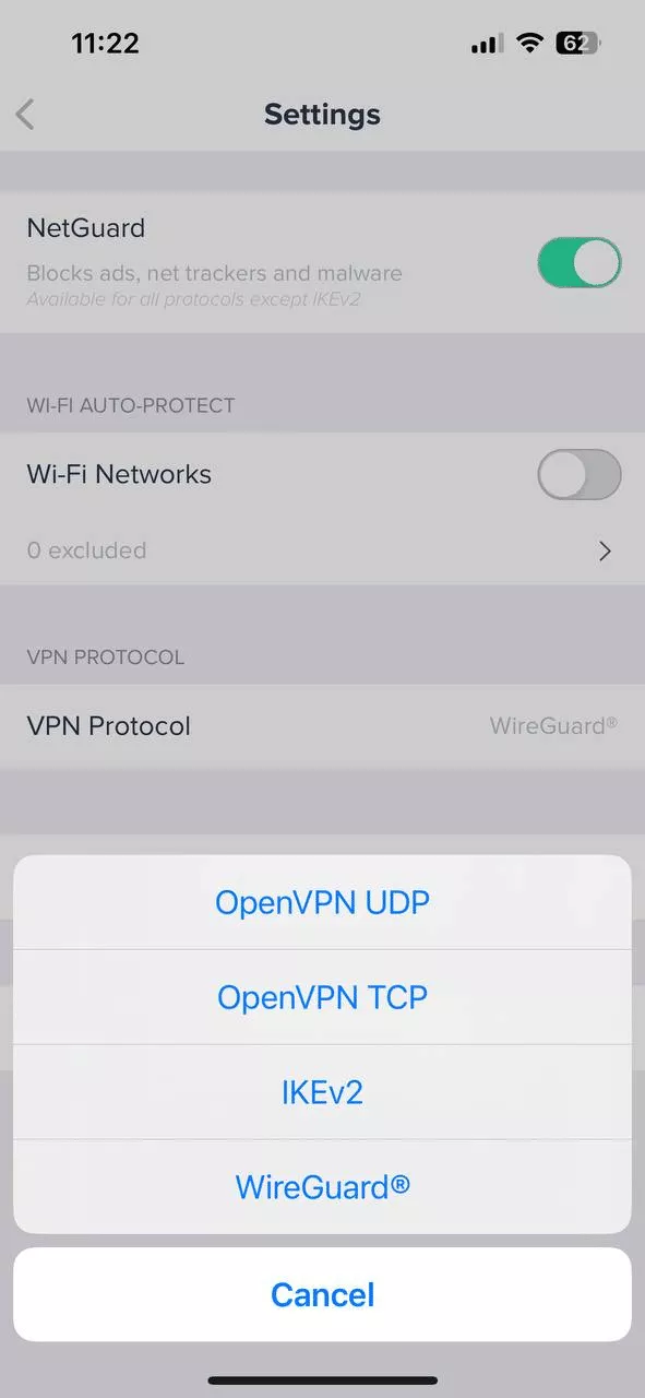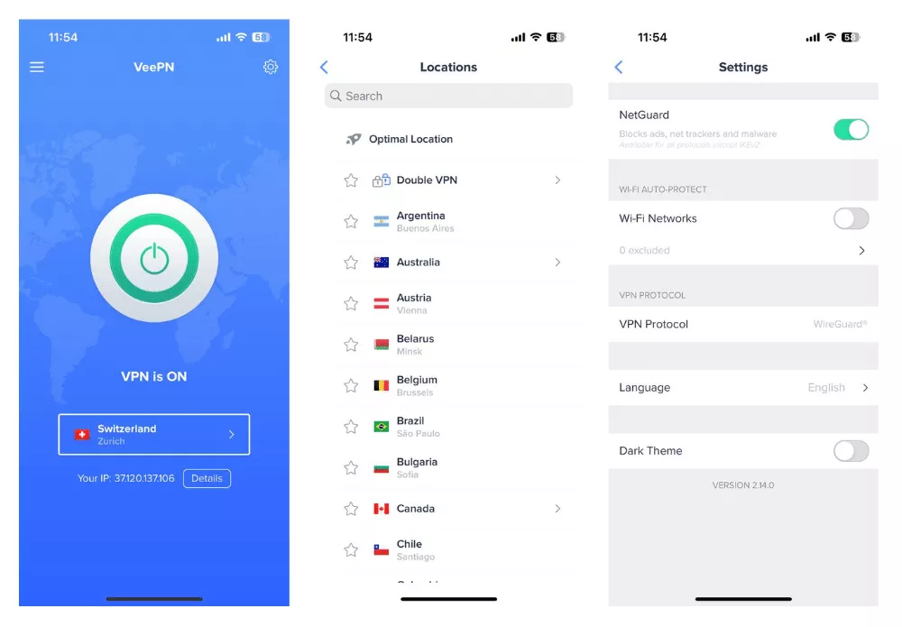 - VPN协议。VEEPN创建了一个加密的隧道,以将您的数据发送到VPN服务器。 VPN协议确定该隧道的实际形成方式。有些人专注于加密数据包,例如OpenVPN,而另一些则优先考虑速度,例如Willeguard®。您可以在应用程序设置中的协议之间切换: