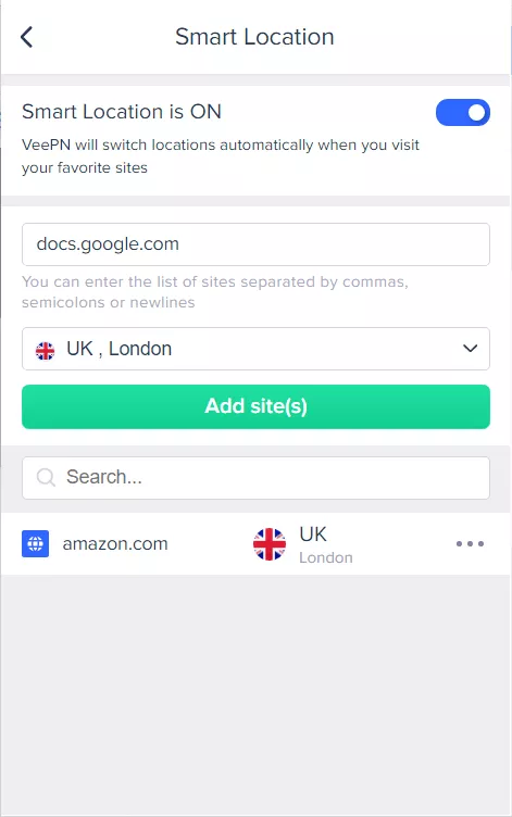 - 智能位置。此功能允许您设置有关如何在某些网站使用VPN连接的规则。通过启用IT,您可以选择VEEPN会更改您的IP地址的网站。转到设置>智能位置以添加带有所需服务器位置的网站: