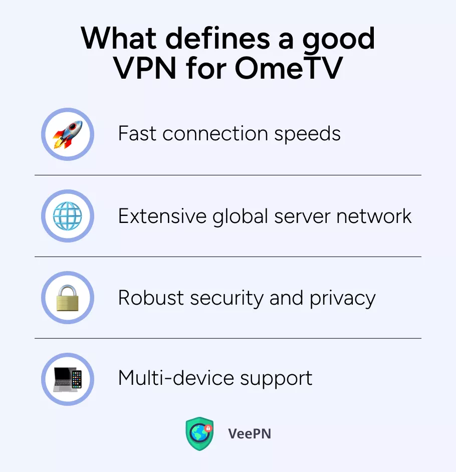 选择正确的 VPN 可以让 OmeTV 的 VPN 运行完美,而使您返回可怕的“连接错误”。重点关注这些必备功能: