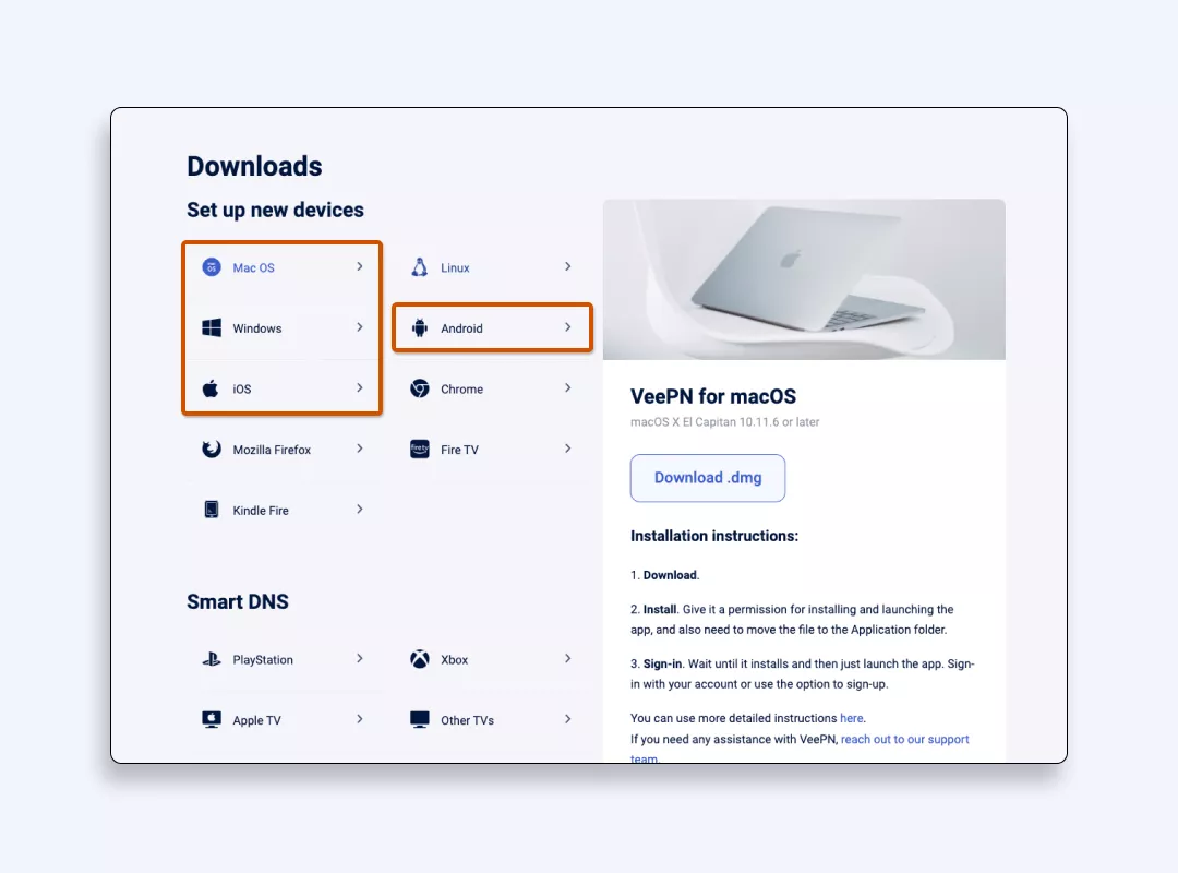 3. 在您用于访问 OmeTV 的设备上下载并安装 VeePN:Windows、Mac、iOS、Android。