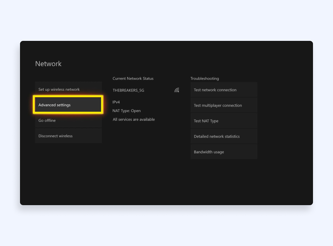 - 高级设置。选择高级设置查看您当前的网络配置。