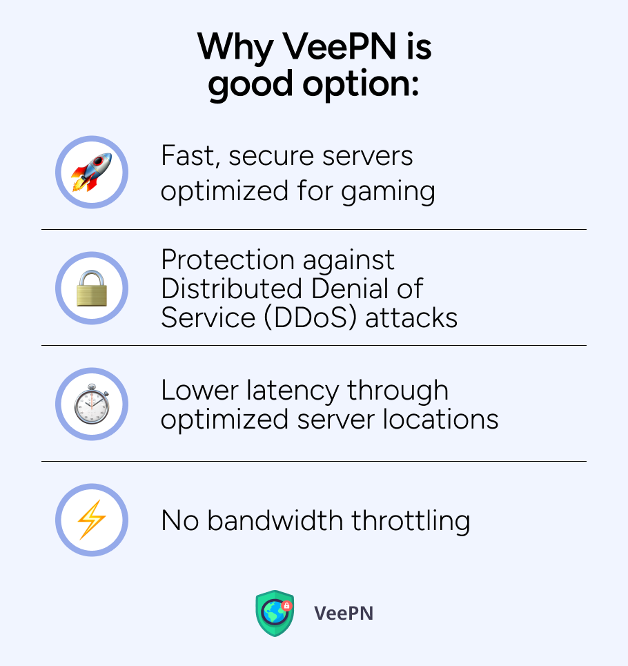 但是,我们建议避免使用免费的VPN,因为它们通常缺乏足够的服务器来为您提供真正高的连接速度。改用VEEPN,因为它可以保证不间断的游戏访问和高级安全功能。如何?让我们更详细地讨论!