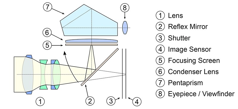 顾名思义,无反光镜相机没有镜子,光线通常通过镜子反射到典型 DSLR 中的 OVF(光学取景器)。相反,在无反光镜相机中,光线通过镜头直接落在传感器上,并将信息发送到 EVF(电子取景器)。 OVF 向您显示场景的实际的、未改变的实时视图,而 EVF 则向您显示传感器处理后的实时预览。