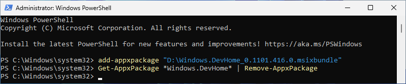 步骤3:类型add-appxpackage "D: Windows.DevHome_0.1101.416.0.msixbundle"
