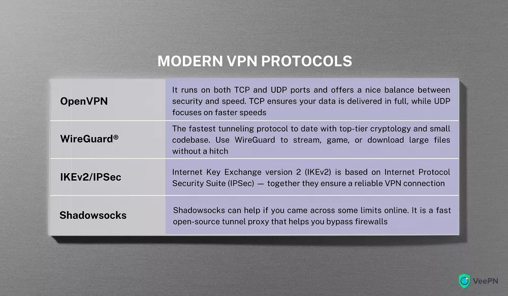 ISP 通常会根据您的互联网流量类型来扼杀您的连接。这可能包括长时间的游戏时间。如果是这种情况,VeePN 可以让您免受互联网限制,甚至由于它使用先进的 VPN 协议而减少过程中的延迟。此外,VeePN 没有任何速度或带宽上限。以下是 VeePN 使用的协议的回顾: