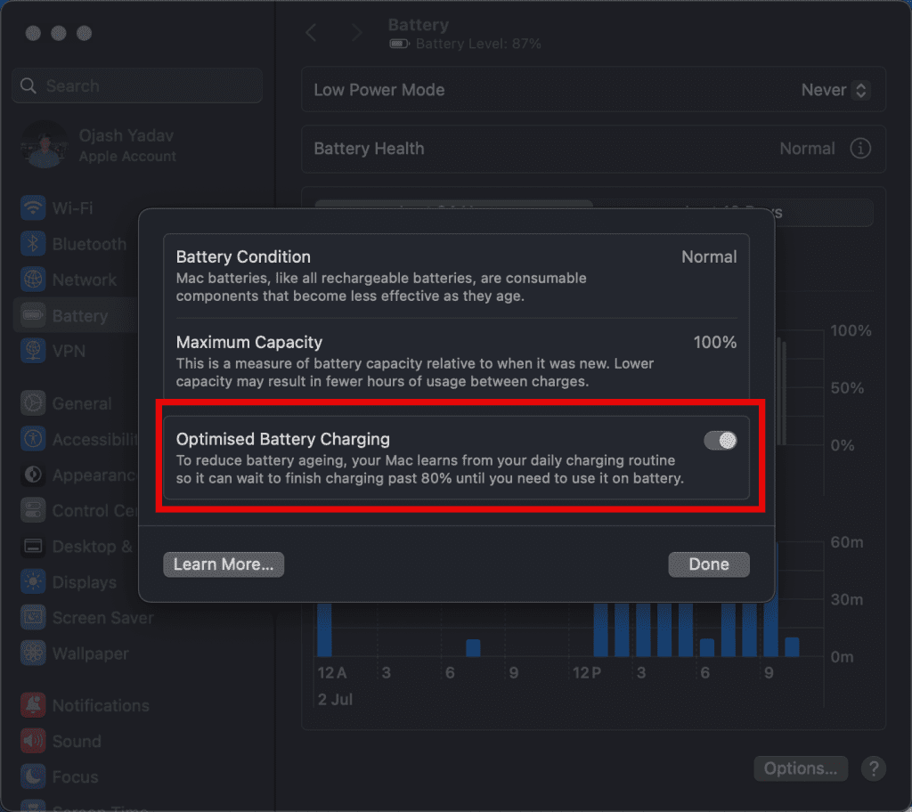 是的,优化电池充电对您的 MacBook 有好处,因为它可以根据您的使用模式智能调整电池的充电方式。这有助于避免过度充电,从而防止电池快速老化,从而延长其整体使用寿命。