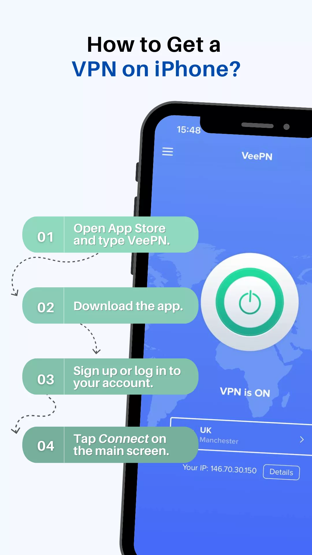 VeePN 在不影响速度的情况下为您的数据提供最佳保护。我们的 NetGuard 功能可让您不受干扰地享受浏览。选择 VeePN 计划并跳过无聊的“iPhone 上的 VPN 配置”部分,并手动配置 iPhone 的 VPN 设置 — 该应用程序将为您完成一切!